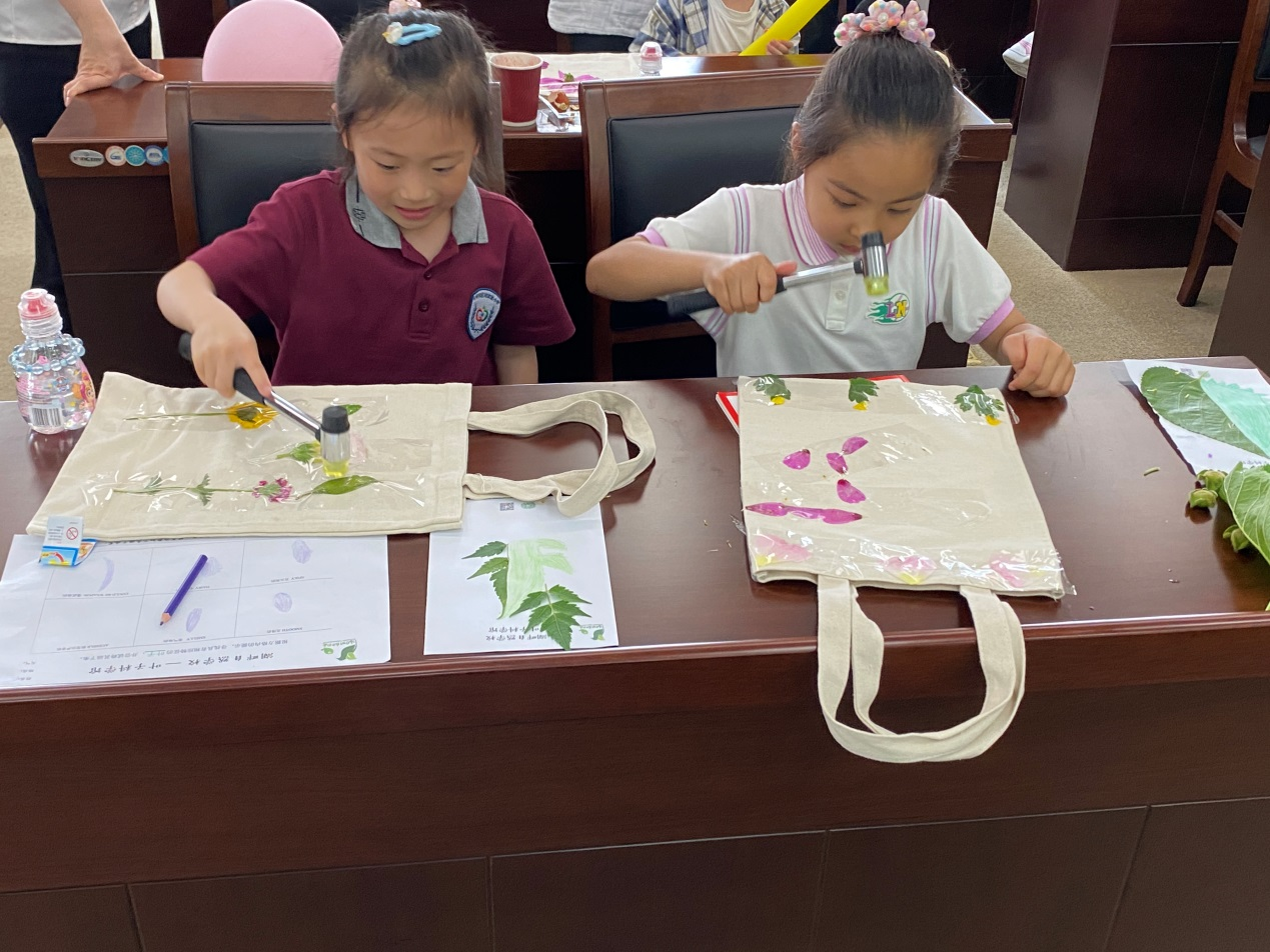 植物拓印,感受自然魅力。為充分發(fā)揮孩子們的創(chuàng)造性,鍛煉動手能力,體驗拓印技藝,領略植物之美,孩子們走近大自然,在文慧園采摘自己喜歡的植物葉子。在仔細甄選葉子的同時,認識了許多樹葉的形狀及名稱,感受植物特有的魅力。采摘完畢,孩子們將自己挑選的各式各樣的植物鋪在帆布包上,用小錘子均勻敲打,將植物的顏色敲進布料里,私人定制自然風帆布包。一花一葉,一顏一色,傳遞出大自然最美妙的秘密,孩子們像發(fā)現(xiàn)了新大陸,不由得驚嘆,紛紛向同伴及家人展示自己的作品。每一個作品都構思巧妙圖案別致,大家紛紛圍觀點評,欣賞彼此的藝術想象力和辛勤勞動的成果,感受著欣喜與快樂。