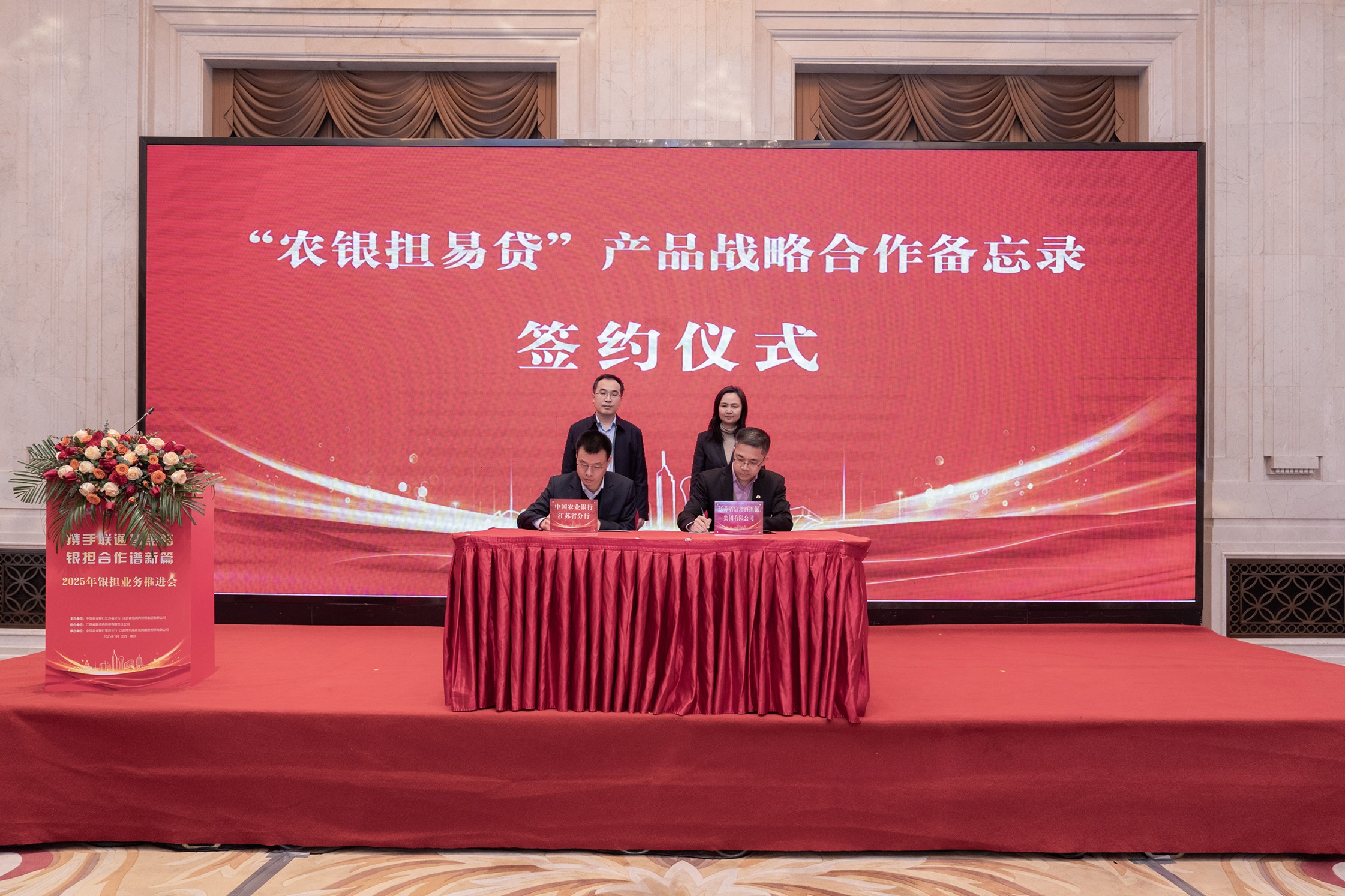 1月9日,江蘇信保集團(tuán)與中國農(nóng)業(yè)銀行江蘇省分行在常州聯(lián)合舉辦2025年銀擔(dān)業(yè)務(wù)推進(jìn)會(huì)。會(huì)議由江蘇省融資再擔(dān)保有限責(zé)任公司協(xié)辦,江蘇信保集團(tuán)常州一體化區(qū)域和中國農(nóng)業(yè)銀行江蘇常州分行聯(lián)合承辦,聚焦“攜手聯(lián)通普惠路 銀擔(dān)合作譜新篇”主題,旨在貫徹中央經(jīng)濟(jì)、金融工作會(huì)議精神,做好金融“五篇大文章”,著力深化銀擔(dān)合作模式,提升普惠金融服務(wù)質(zhì)效。集團(tuán)黨委副書記張靖與中國農(nóng)業(yè)銀行江蘇省分行黨委委員、副行長(zhǎng)曹杰存出席會(huì)議并致辭,集團(tuán)總裁助理藍(lán)波出席會(huì)議。