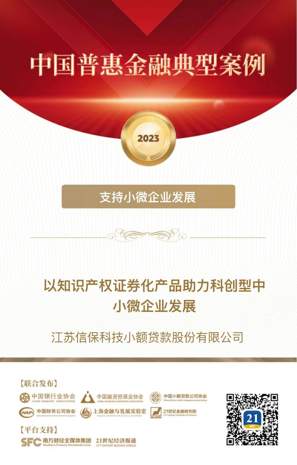 9月19日,“合普惠 新金融——2023中國(guó)普惠金融創(chuàng)新發(fā)展研討暨典型案例發(fā)布會(huì)”在北京舉辦,“中國(guó)普惠金融典型案例(2023)”名單在會(huì)上正式揭曉,由江蘇信??萍夹☆~貸款股份有限公司(下稱“信??瀑J”)報(bào)送的《以知識(shí)產(chǎn)權(quán)證券化產(chǎn)品助力科創(chuàng)型中小微企業(yè)發(fā)展》案例從全國(guó)761個(gè)參評(píng)案例中脫穎而出,入圍“支持小微企業(yè)發(fā)展案例”。