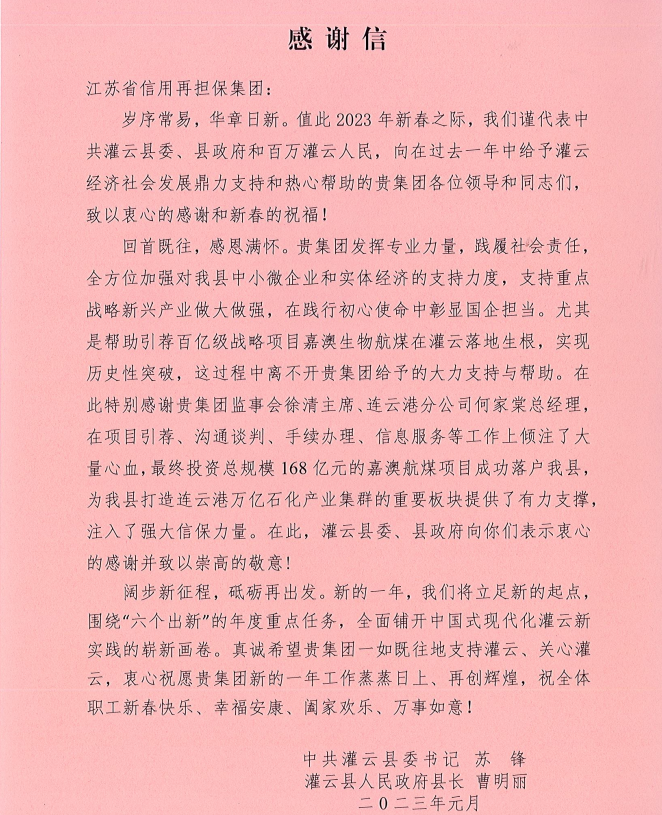 日前,連云港市灌云縣向集團發(fā)來感謝信,感謝集團長期以來對灌云縣中小微企業(yè)和實體經(jīng)濟的大力支持,尤其是連云港分公司助力引薦百億級戰(zhàn)略項目嘉澳生物航煤項目落戶灌云。