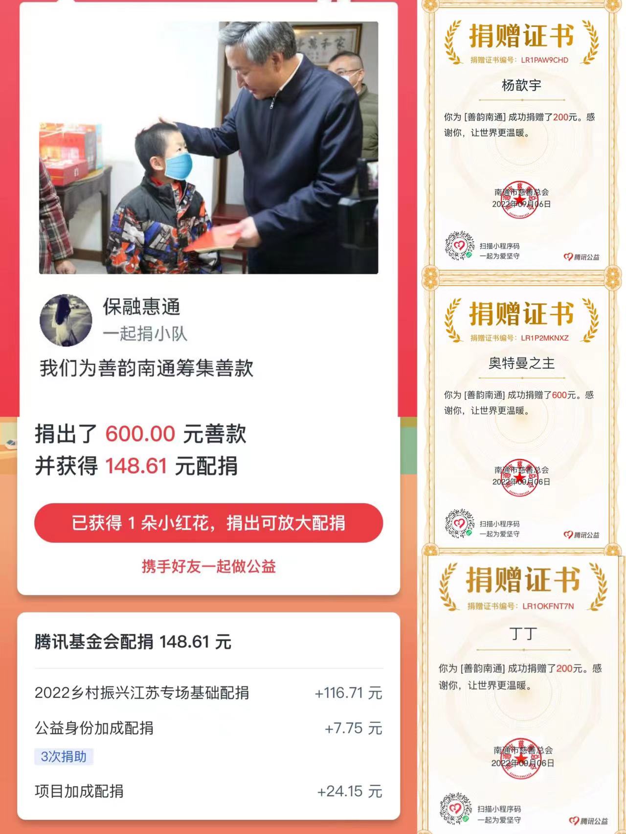 本次慈善一日捐活動,南通地區(qū)黨支部通過“騰訊公益”小程序組建“保融惠通” 捐小隊開展統(tǒng)一捐款。公司全體員工踴躍參與,通過線上捐贈善款,這筆善款將統(tǒng)一交至南通市慈善總工會,用于特困未成年人關愛服務等慈善救助項目,為南通地區(qū)的慈善事業(yè)貢獻信保力量,目前已有38個金融機構參與本次活動。