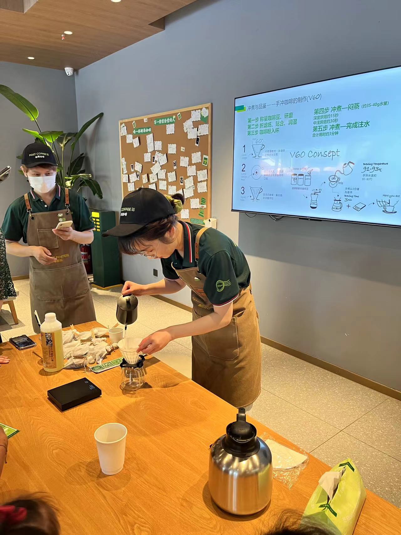 “咖啡豆最初的顏色是什么?不同的烘焙程度有何口感?……”郵局咖啡的咖啡志愿者通過(guò)咖啡歷史文化課堂、手沖咖啡教學(xué)、咖啡渣手工皂、盆栽DIY等環(huán)節(jié)帶領(lǐng)孩子們認(rèn)識(shí)咖啡、制作咖啡??Х葞煵捎脠D文講解的方式為大家科普了咖啡豆的采摘、處理、烘焙等基礎(chǔ)知識(shí),在咖啡師生動(dòng)的講解下,這些疑惑被一一解答。活動(dòng)的重頭戲是手沖咖啡制作環(huán)節(jié),咖啡師一番優(yōu)雅展示后,孩子們躍躍欲試,折濾紙,預(yù)熱,倒入咖啡粉,一次悶蒸,再注水……雖然動(dòng)作生疏,但“小小咖啡師”們都有模有樣。不一會(huì),一杯杯醇香的沖泡黑咖順利完成,活動(dòng)室內(nèi)散發(fā)出淡淡的咖啡香。