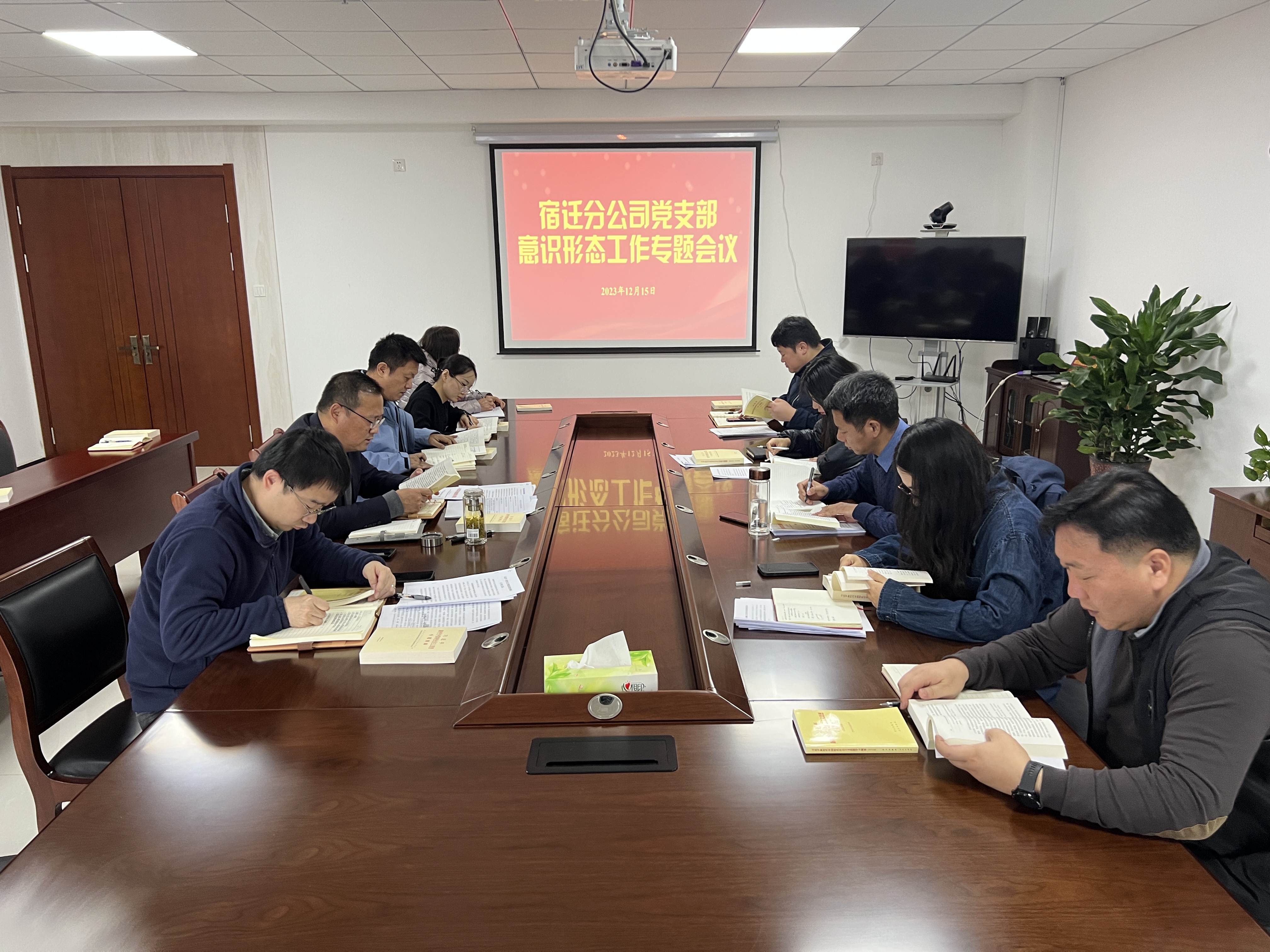 12月15日,宿遷分公司黨支部召開意識(shí)形態(tài)工作專題會(huì)議,深入學(xué)習(xí)領(lǐng)會(huì)習(xí)近平總書記關(guān)于意識(shí)形態(tài)工作的重要論述。黨支部負(fù)責(zé)人主持會(huì)議并講話,全體員工參加會(huì)議。