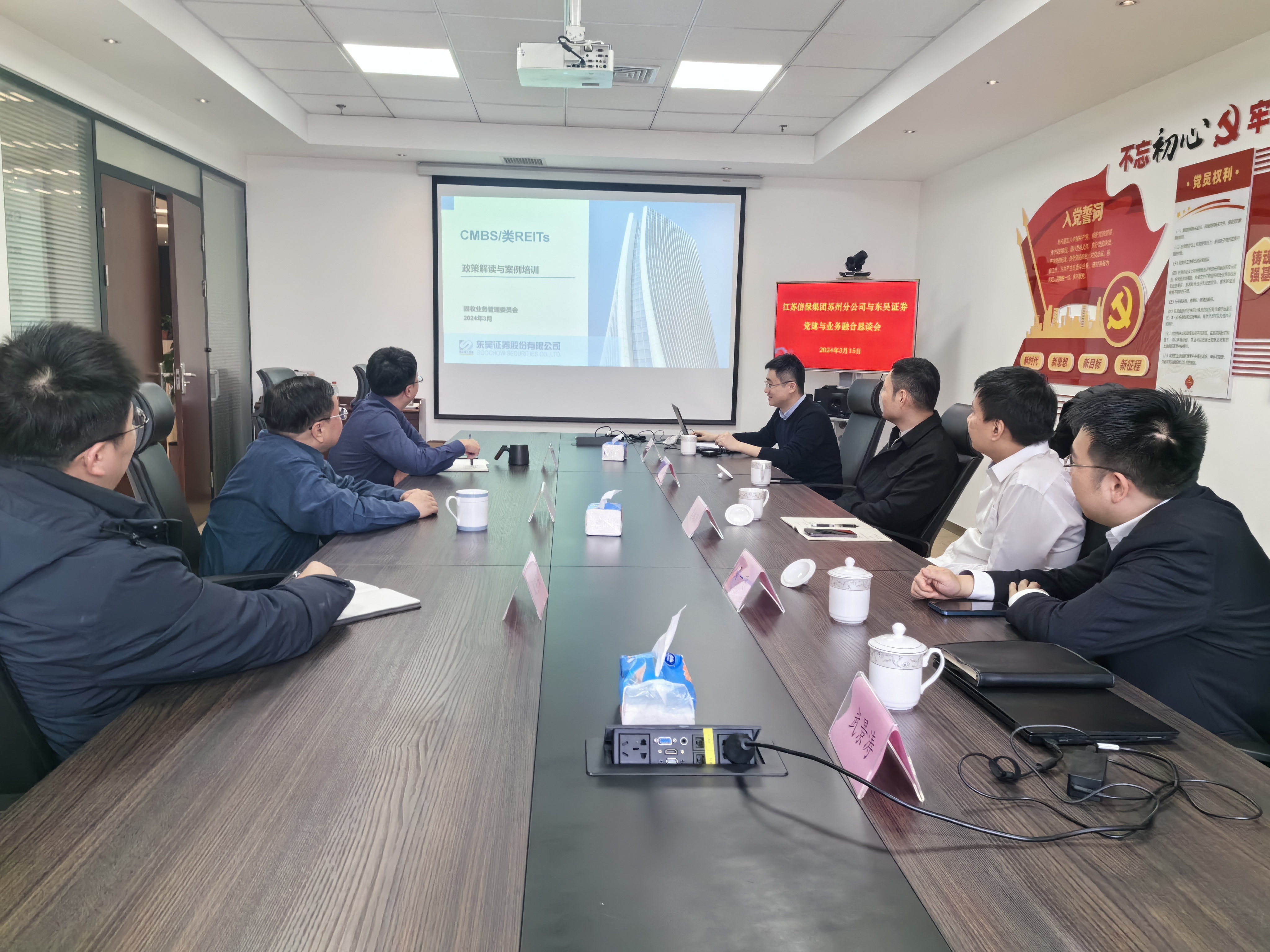 會(huì)上,雙方充分肯定了前期合作的成果,交流各自在黨建與業(yè)務(wù)相融合工作中取得的經(jīng)驗(yàn)成效,針對(duì)當(dāng)前債券市場(chǎng)政策、平臺(tái)企業(yè)融資狀況、雙方擬推進(jìn)的項(xiàng)目等展開討論交流。現(xiàn)場(chǎng)東吳證券對(duì)CMBS、類REITs政策進(jìn)行了解讀與案例分析。座談會(huì)氣氛熱烈、交流深入、富有成效,為雙方下一步加強(qiáng)合作奠定堅(jiān)實(shí)基礎(chǔ)。