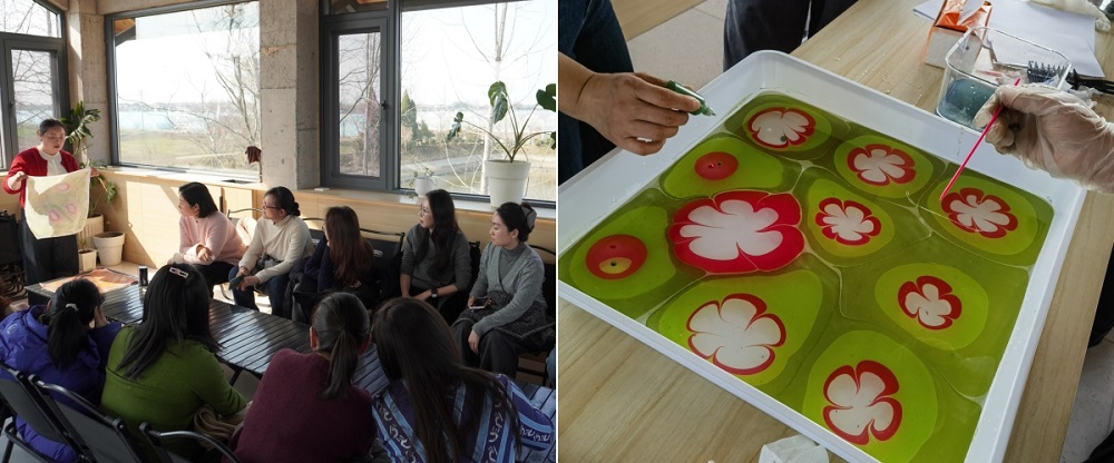 在非遺體驗活動現(xiàn)場,大家根據(jù)自己的喜好,將染料滴入水中,或輕輕撥動水面,或精準滴落,層層疊疊的顏色在水面上緩緩鋪展,相互交織,相互融合,最終,這些圖案被巧妙地轉(zhuǎn)移到絲巾上,每條絲巾都成為了獨一無二的“手工限量版”。