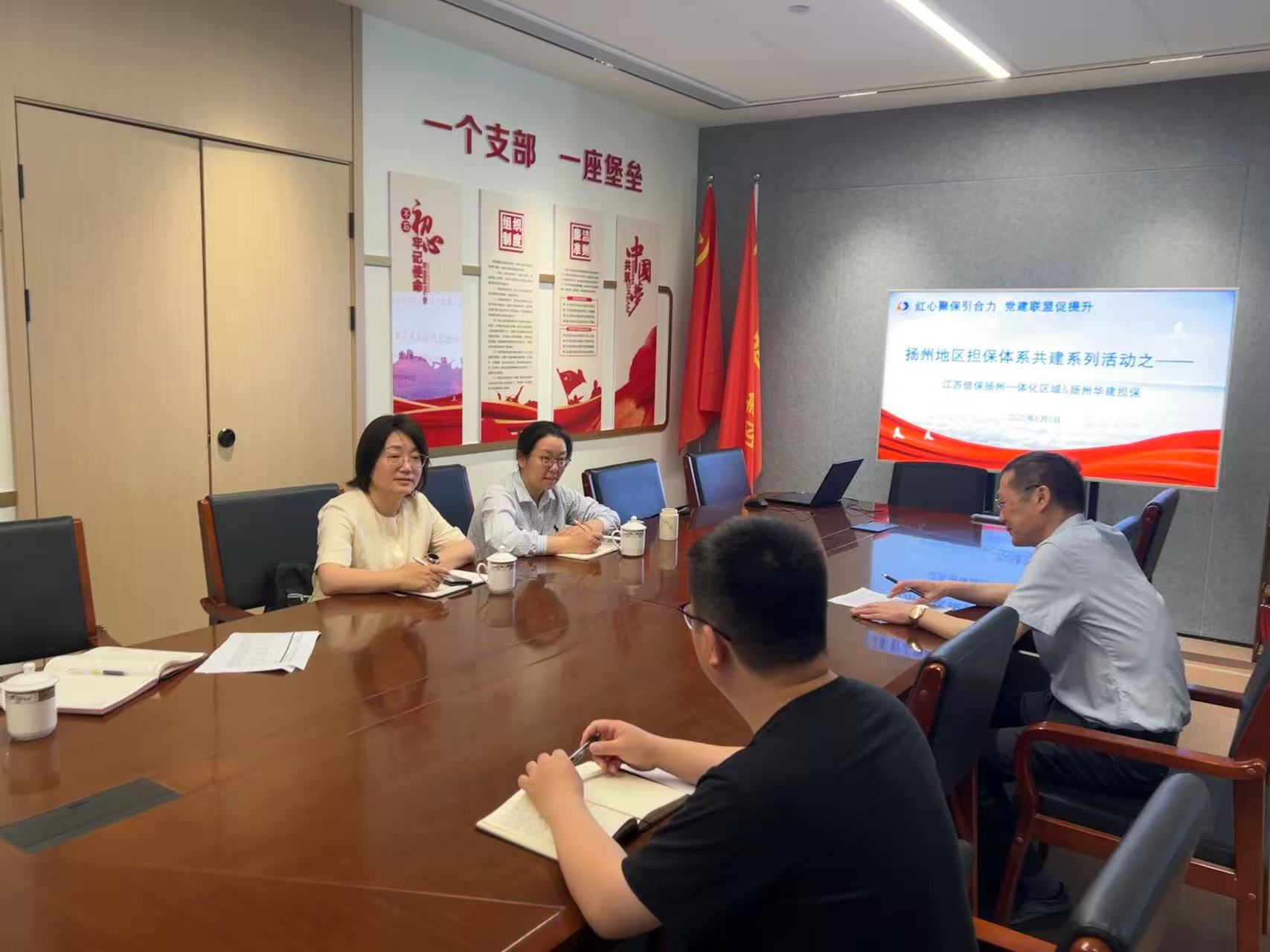 在交流會上,揚州一體化區(qū)域與華建擔保、龍川擔保圍繞黨建工作經(jīng)驗、廉潔文化建設等內(nèi)容展開深入探討,各方相互分享了在黨建活動創(chuàng)新、黨員教育管理、黨風廉政建設等方面的成功經(jīng)驗和具體做法。針對當前擔保行業(yè)面臨的機遇與挑戰(zhàn),與會各方從風險防控、產(chǎn)品創(chuàng)新、服務實體經(jīng)濟等方面進行了深入分析,共同探討如何以黨建為紐帶,構建更加緊密的合作關系,在普惠產(chǎn)品創(chuàng)新、優(yōu)化銀擔比例、提升服務質效等方面達成共識,為今后在業(yè)務協(xié)同、風險共擔等領域開展深度合作奠定了堅實基礎。