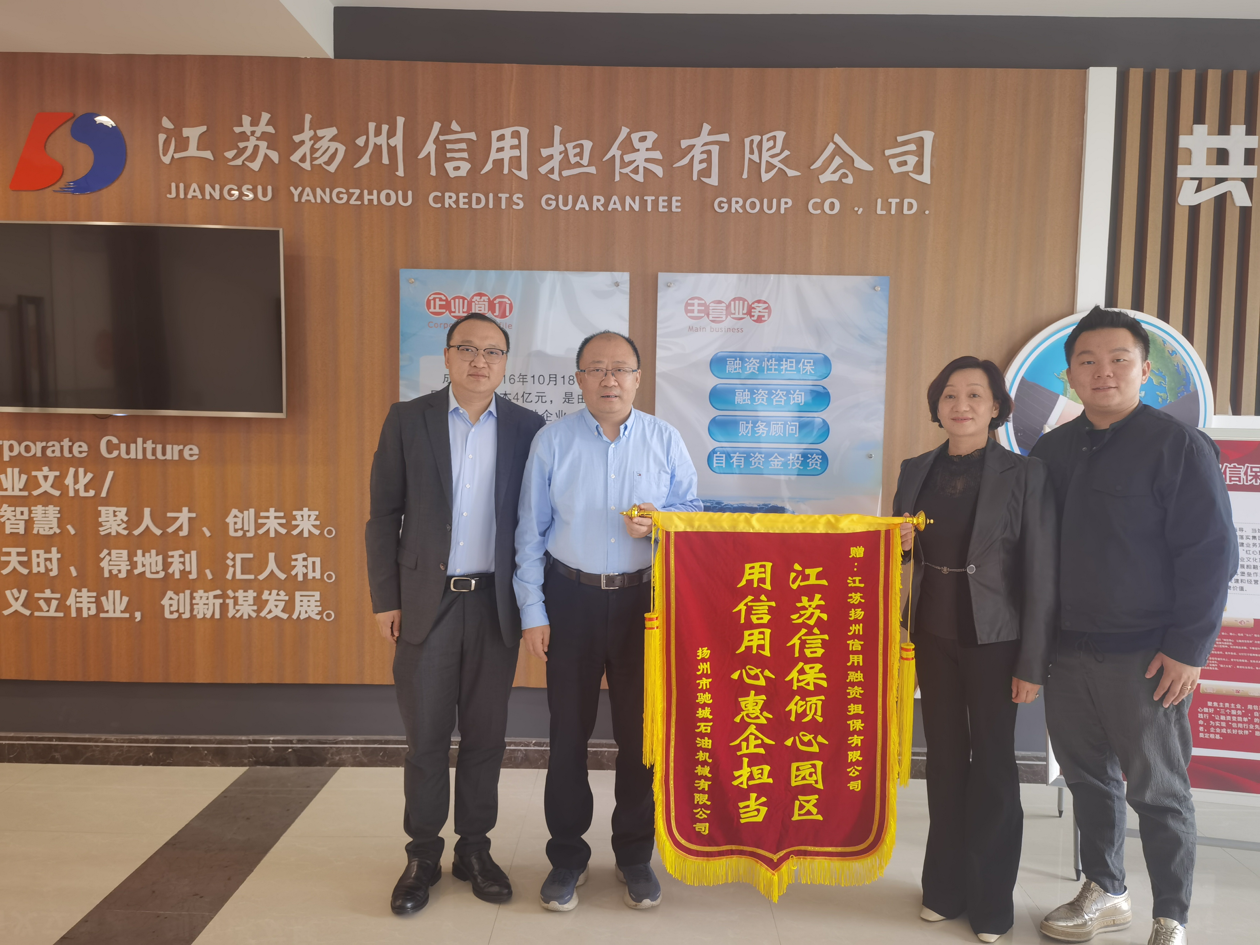 5月12日,揚(yáng)州市馳城石油機(jī)械有限公司負(fù)責(zé)人一行赴揚(yáng)州一體化區(qū)域,送上“江蘇信保傾心園區(qū)用信用心惠企擔(dān)當(dāng)”錦旗,對(duì)揚(yáng)州擔(dān)保在疫情期間給予企業(yè)的惠企降費(fèi)政策和綜合金融服務(wù)表示衷心感謝。