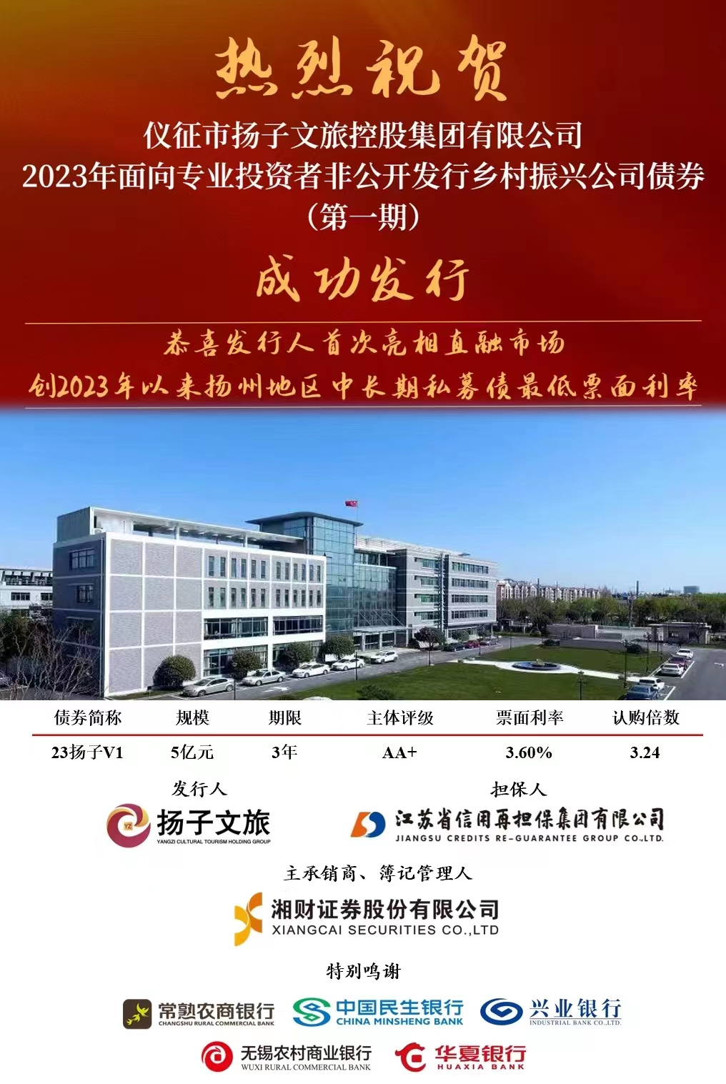 5月20日,揚(yáng)州一體化區(qū)域推動(dòng)的集團(tuán)首單債券增信“總包”方案---儀征市揚(yáng)子文旅控股集團(tuán)有限公司2023年面向?qū)I(yè)投資者非公開發(fā)行鄉(xiāng)村振興公司債券成功簿記發(fā)行,發(fā)行規(guī)模5億元,發(fā)行期限3年,全場(chǎng)認(rèn)購(gòu)倍數(shù)3.24,最終票面利率3.60%,創(chuàng)下今年以來?yè)P(yáng)州地區(qū)中長(zhǎng)期限公司債最低票面利率。