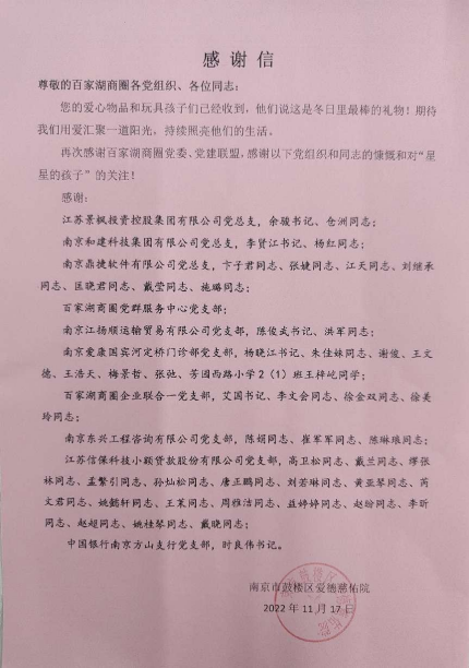 近日,江蘇信??瀑J公司黨支部收到南京市鼓樓區(qū)愛德慈佑院為南京市江寧區(qū)百家湖商圈的黨組織發(fā)來的感謝信,信中感謝科貸公司黨支部及其18名黨員群眾對(duì)“星星的孩子”的關(guān)愛。