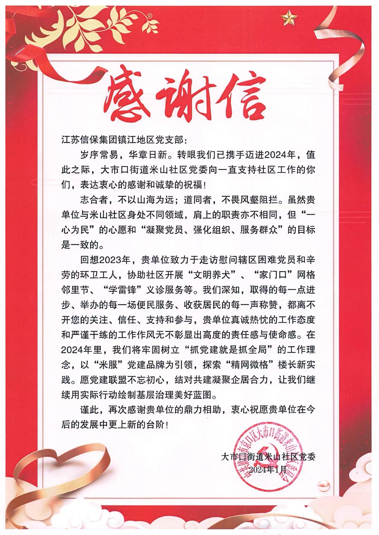 2024年1月,江蘇信保集團鎮(zhèn)江地區(qū)黨支部收到來自鎮(zhèn)江大市口街道米山社區(qū)黨委的感謝信,感謝鎮(zhèn)江一體化區(qū)域及鎮(zhèn)江地區(qū)黨支部對大市口街道米山社區(qū)工作的關心及支持。祝愿雙方黨建聯(lián)盟不忘初心,結對共建凝聚企居合力。